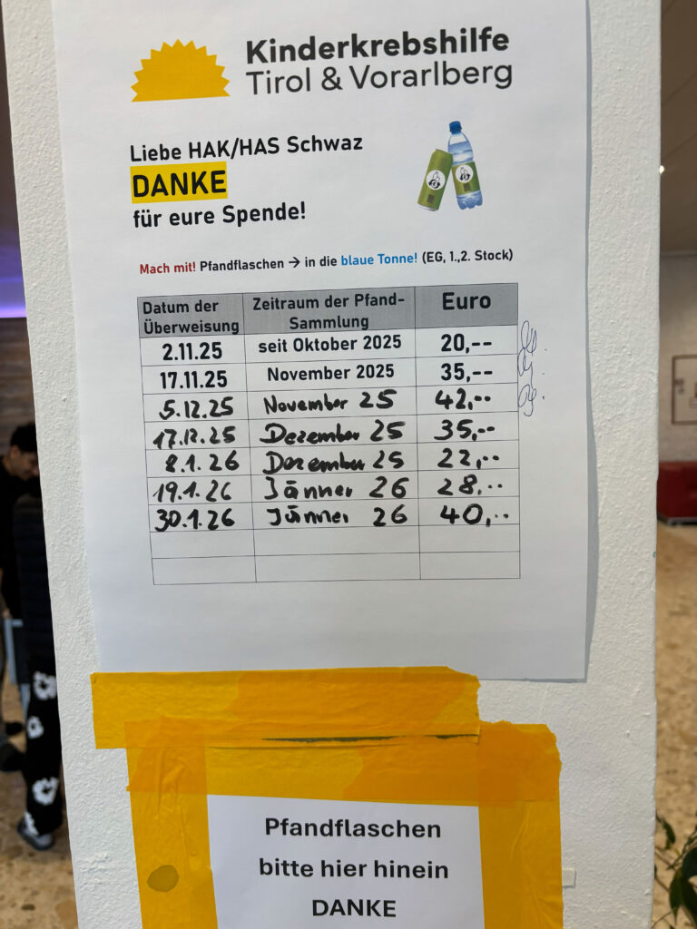 Die 3AK und seit Jänner 2026 auch die 3BK bringen die Pfandflaschen alle 2 Wochen zur Rückgabe, das Geld kommt der Kinderkrebshilfe Tirol zugute. Danke für die Spenden. EURO 222,– in nur 3 Monaten!