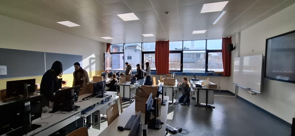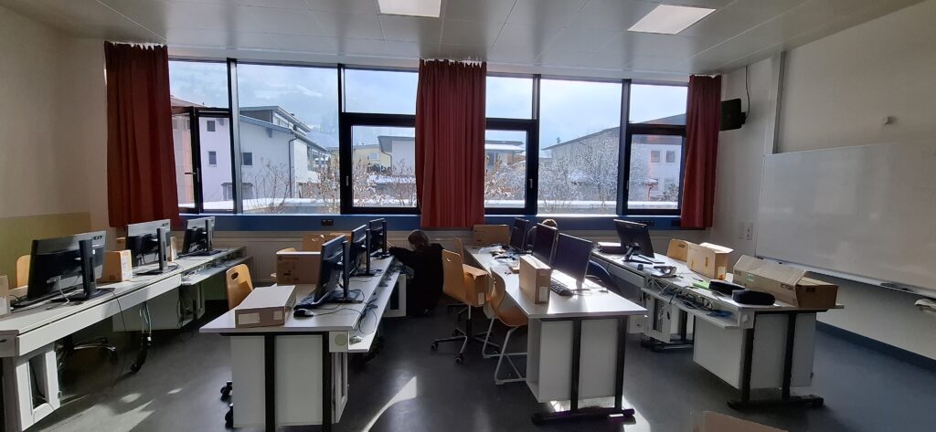 Unter der Anleitung von Prof. Allram wurde im NTMA (Netzwerkmanagement) Unterricht fleißig gearbeitet – und das mit großem Erfolg: In Rekordzeit war der Saal einsatzbereit, und fast alle PCs liefen auf Anhieb fehlerfrei ✅
